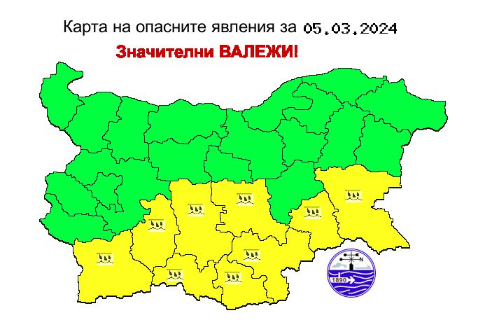 Във вторник е обявен жълт код за значителни валежи в области от Югозападна, Южна и Югоизточна България: Бургас, Ямбол, Стара Загора, Хасково, Кърджали, Пловдив, Смолян, Пазарджик, Благоевград.