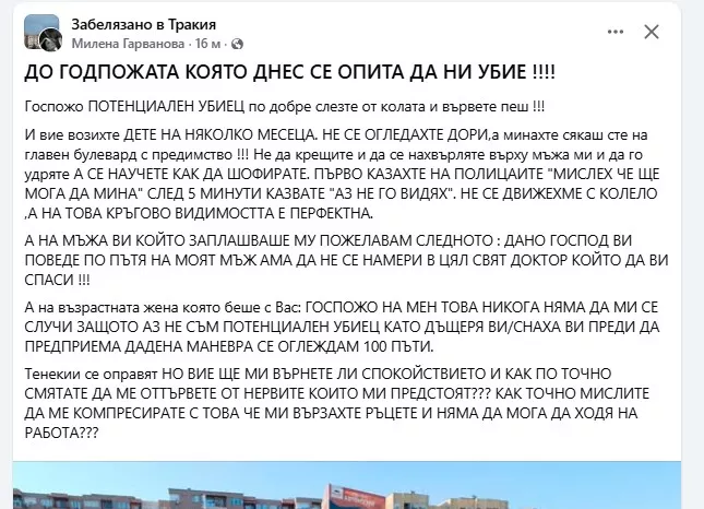 Часове след инцидента жена, която твърди, че е сред потърпевшите, публикува емоционален и гневен пост във фейсбук група. В него тя отправя остри обвинения към другата шофьорка, за която твърди, че е управлявала BMW и е причинила катастрофата и е била с малко дете в колата.