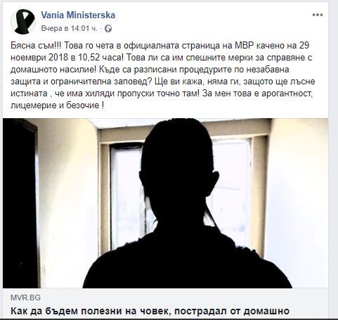 "Бясна съм! Това го чета в официалната страница на МВР качено на 29 ноември 2018 в 10,52 часа! Това ли са им спешните мерки за справяне с домашното насилие! Къде са разписани процедурите по незабавна защита и ограничителна заповед? Ще ви кажа, няма ги, защото ще лъсне истината , че има хиляди пропуски точно там! За мен това е арогантност, лицемерие и безочие !", пише майката.