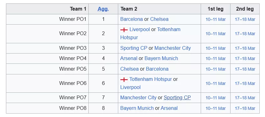 В топ 8 и директно за осминафиналите се класираха Арсенал, Байерн Мюнхен, Ливърпул, Тотнъм, Барселона, Челси, Спортинг Лисабон, Манчестър Сити.