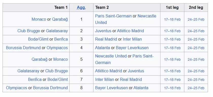 Отборите от 9-то до 24-то място ще играят допълнителен плейоф за влизане в топ 8, а те са: Реал Мадрид, Интер, ПСЖ, Нюкасъл, Ювентус, Атлетико Мадрид, Аталанта, Байер Леверкузен, Борусия Дортмунд, Олимпиакос, Брюж, Галатасарай, Монако, Карабах, Бодьо/Глимт, Бенфика.