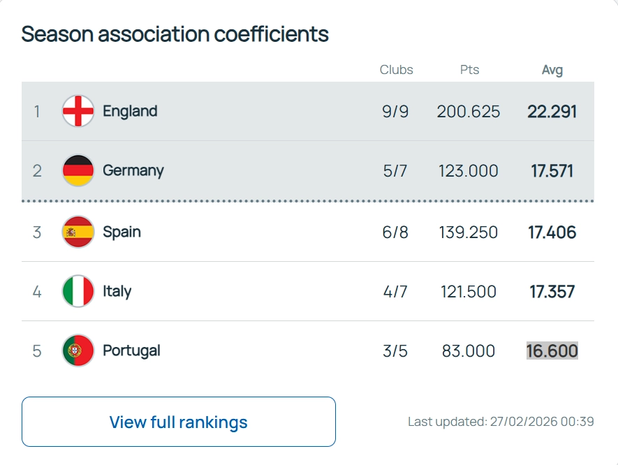 На този етап преди осминафиналите в евротурнирите Германия е на второто място с коефициент 17.571 точки, трети са испанците със 17.406 точки, Италия е на четвъртата позиция със 17.357 точки, а петото място е за Португалия с 16.600 точки.