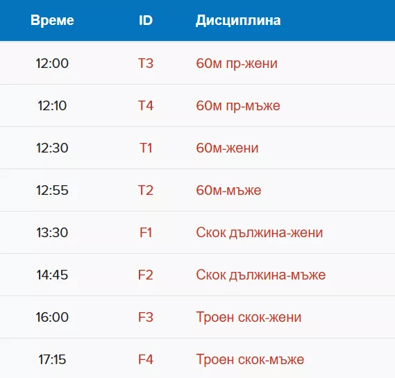 Иначе общо се проведат 4 дисциплини - 60 м., 60 м. с прептяствия, троен скок и скок дължина, като всичките 4 дисциплини ще бъдат за мъже и жени.