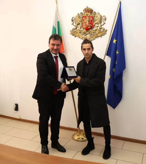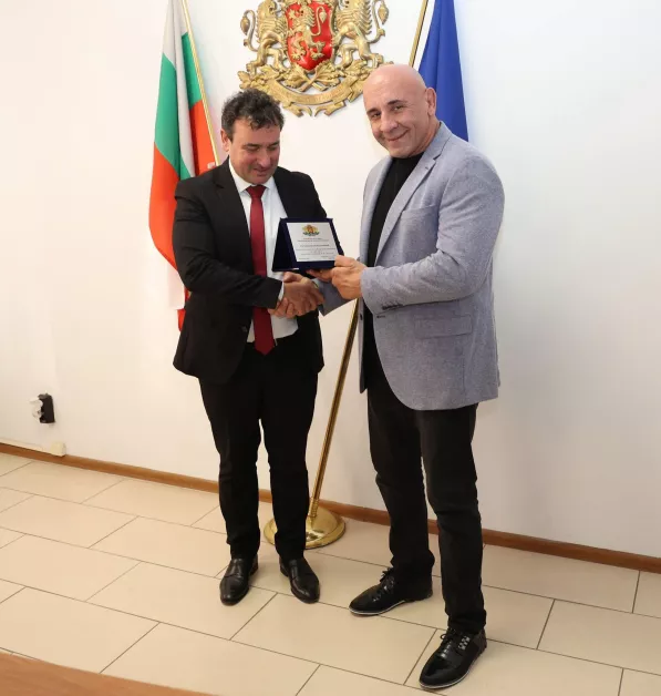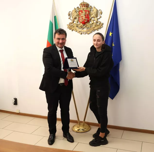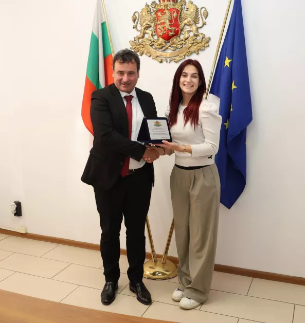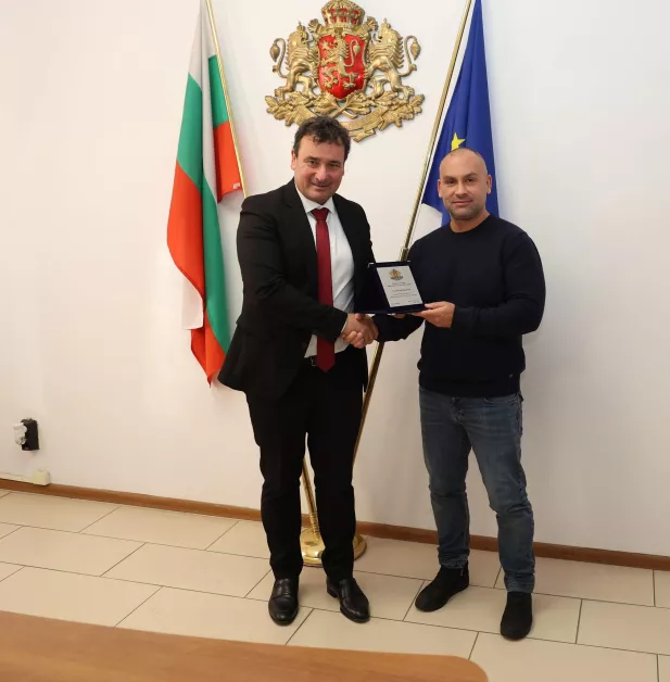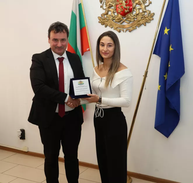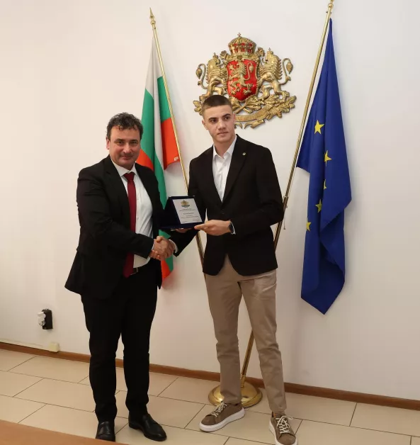 Зам.-министър Димитър Георгиев връчи почетни плакети и на бронзовите медалисти от Европейското първенство по муай тай до 23 години Еми Данова и Виктор Крашевски, както и на техния треньор Станислав Бахчеванов.