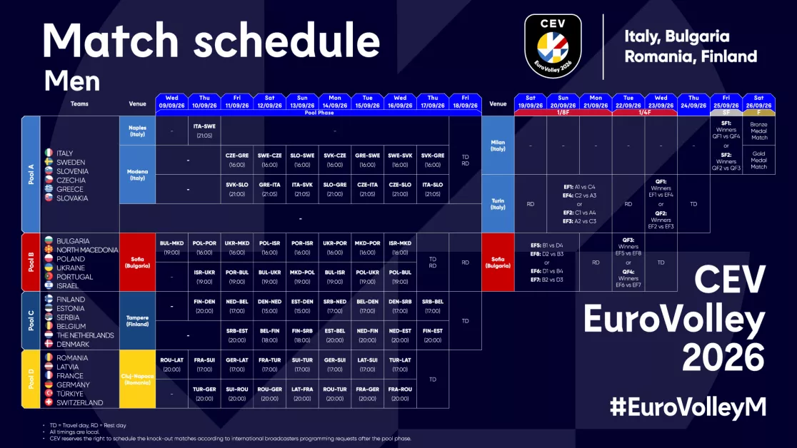 Турнирът ще се проведе между 10 и 27 септември 2026 г. в Италия, България, Финландия и Румъния, а всички срещи на нашия национален отбор ще се играят в „Арена София“.