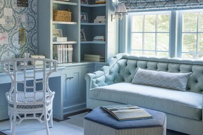Ако искате цветове, които носят свежест и напомнят на морето, небесно синьото е най-добрият избор. В комбинация с дървени мебели, този цвят наистина ще внесе положително настроение във вашия дом. Можете да го използвате на стената, завеси, килим или декоративни възглавници.