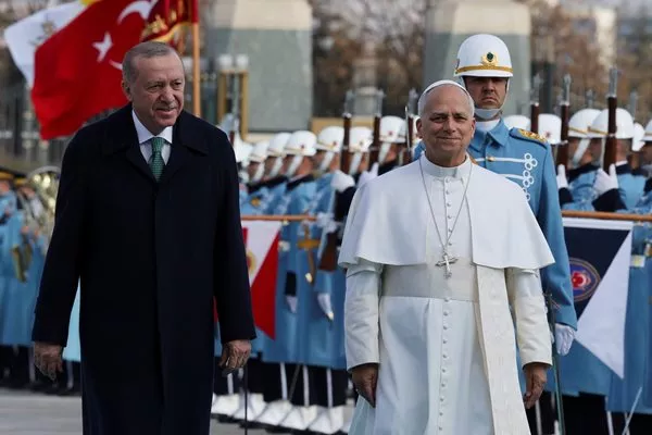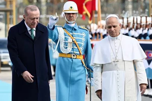 Турският президент Реджеп Ердоган посрещна папа Лъв XIV в президентския дворец в Анкара, предаде БТА. Делегацията на главата на Римокатолическата църква беше предвождана от конна военна част, а по време на официалната церемония, на която прозвучаха химните на Ватикана и Турция, бяха изстреляни топовни салюти.
