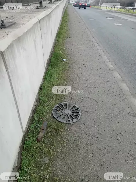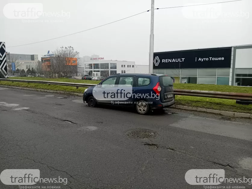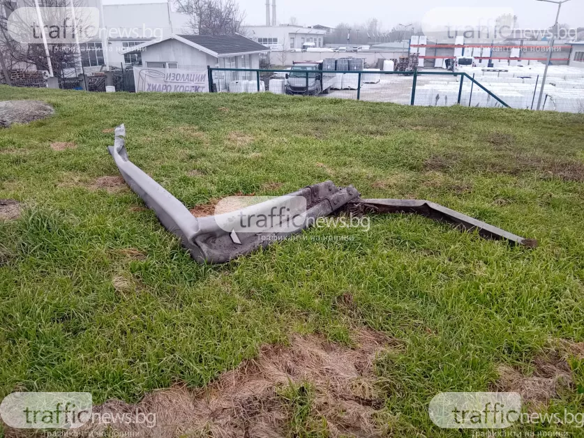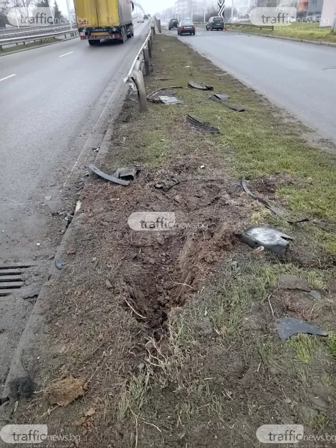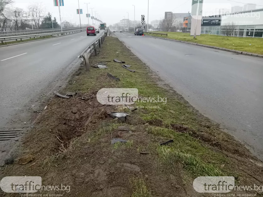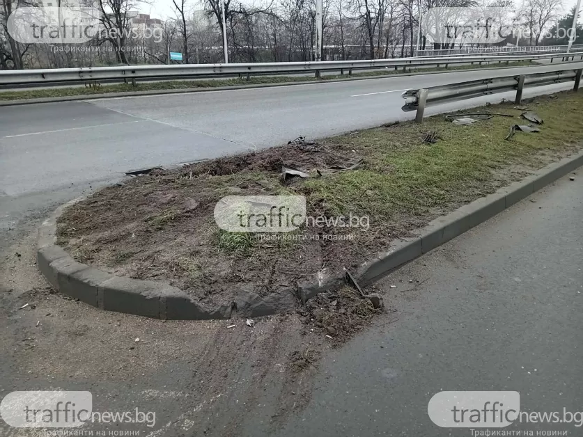 Любопитното е, че втората кола – „Дачия“, е преминала по абсолютно същия маршрут през островчето и мантинелата. И по нея има тежки материални щети, включително по предната част и гумите.