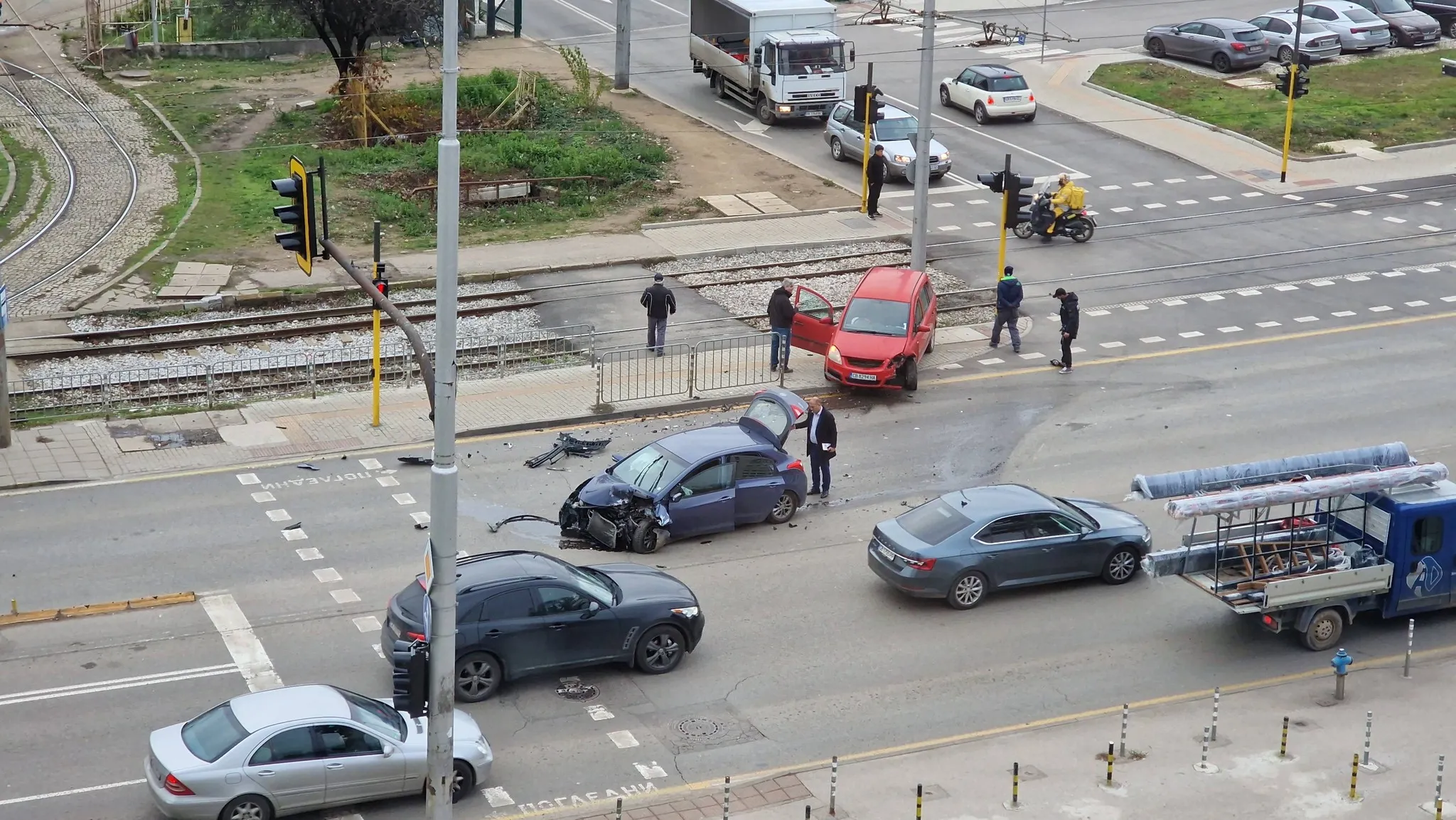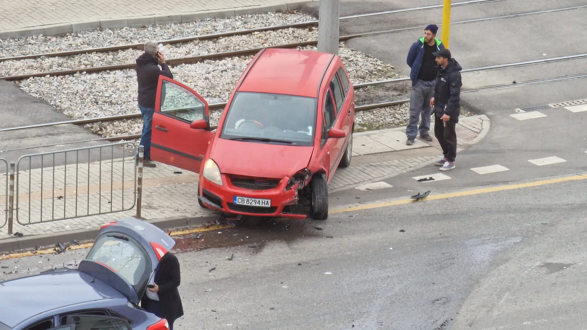 Едната машина е с помляна предница, другата е изхвърчала на тротоара, непосредствено до трамвайните релси.