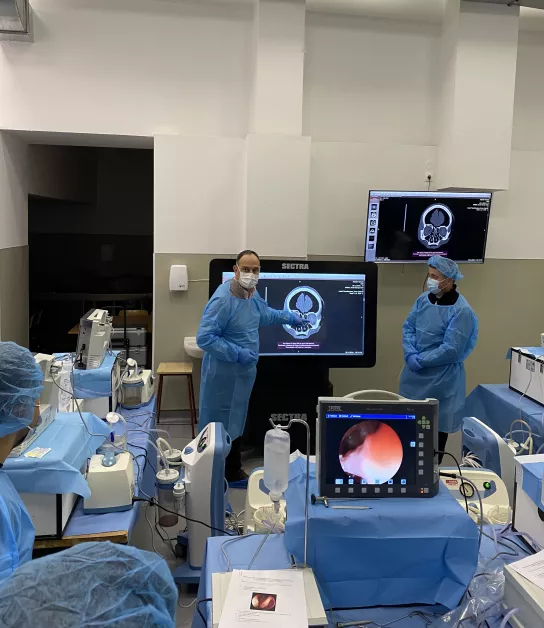 В рамките на първия модул обучението започна с ендоскопска дисекция на нос, околоносни кухини и слъзни пътища върху кадавър. Наставници на участниците бяха проф. д-р Карен Джамбазов, д.м., и доц. д-р Христо Златанов от Военномедицинска академия – ВМА.